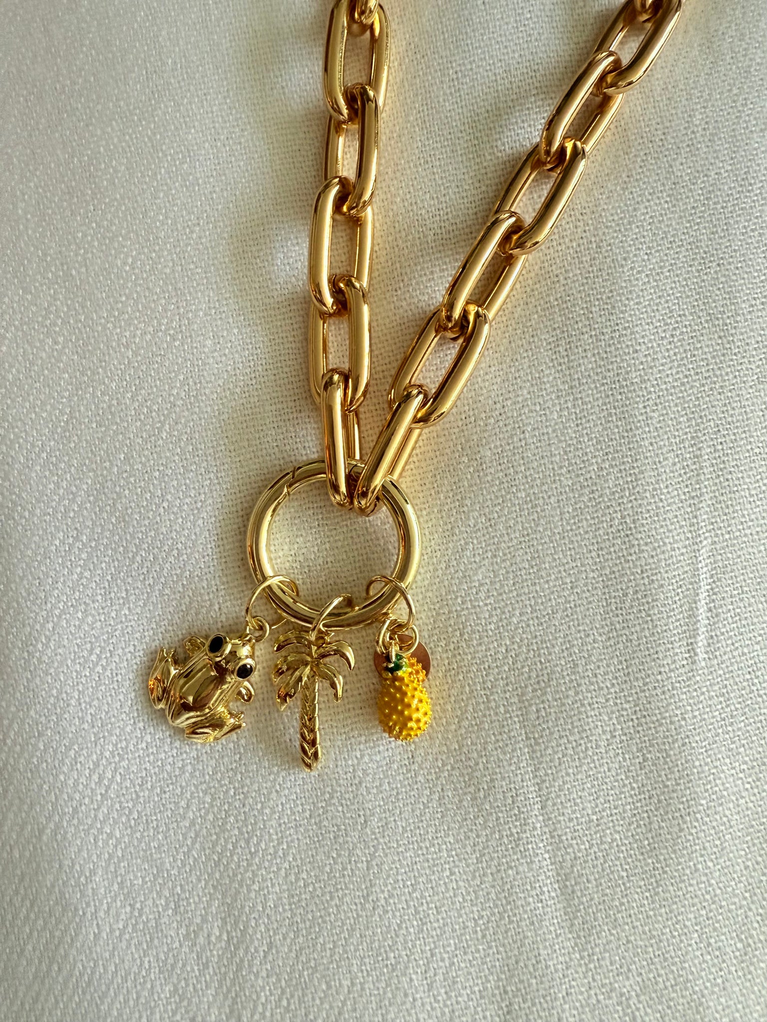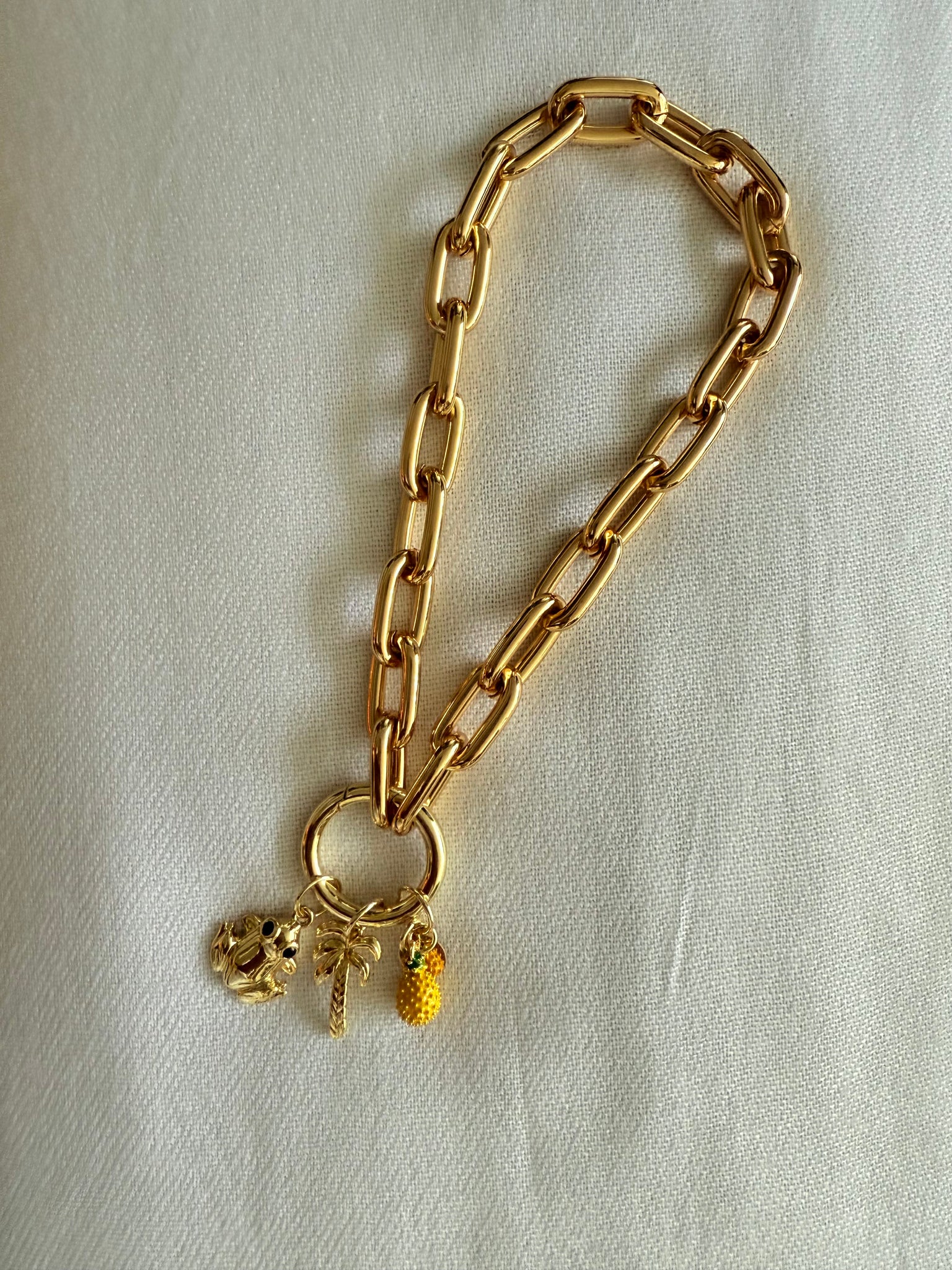 Iphone Bracelet/Holder in Thick Chain with Triple Charms Piña/Pineapple, Palm and Coqui in 18k gold plated