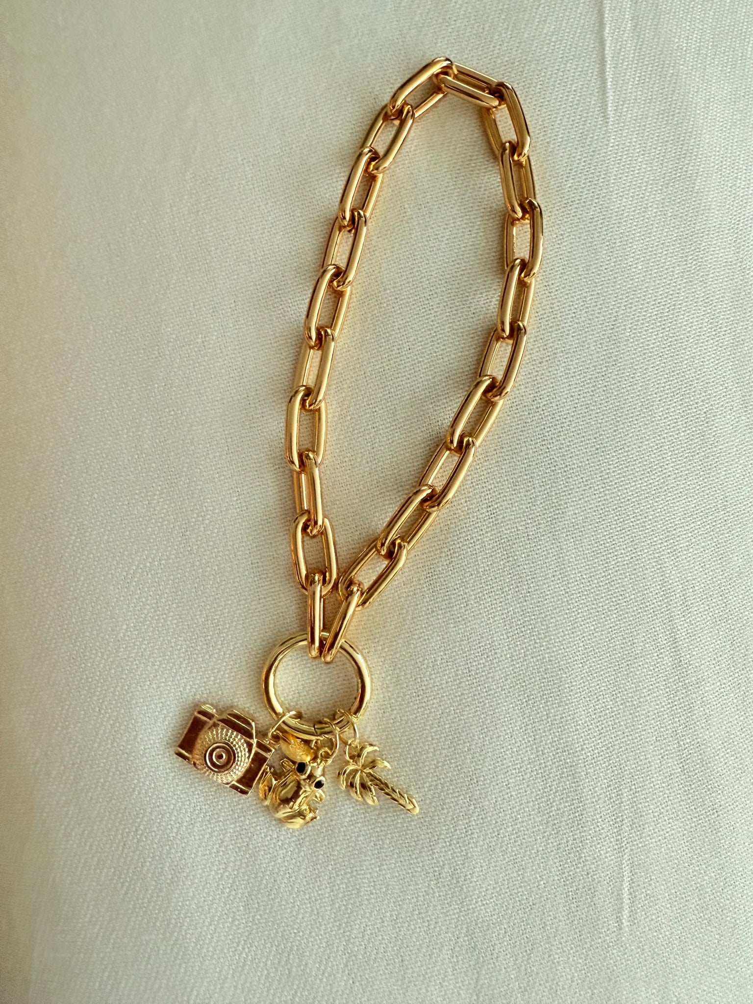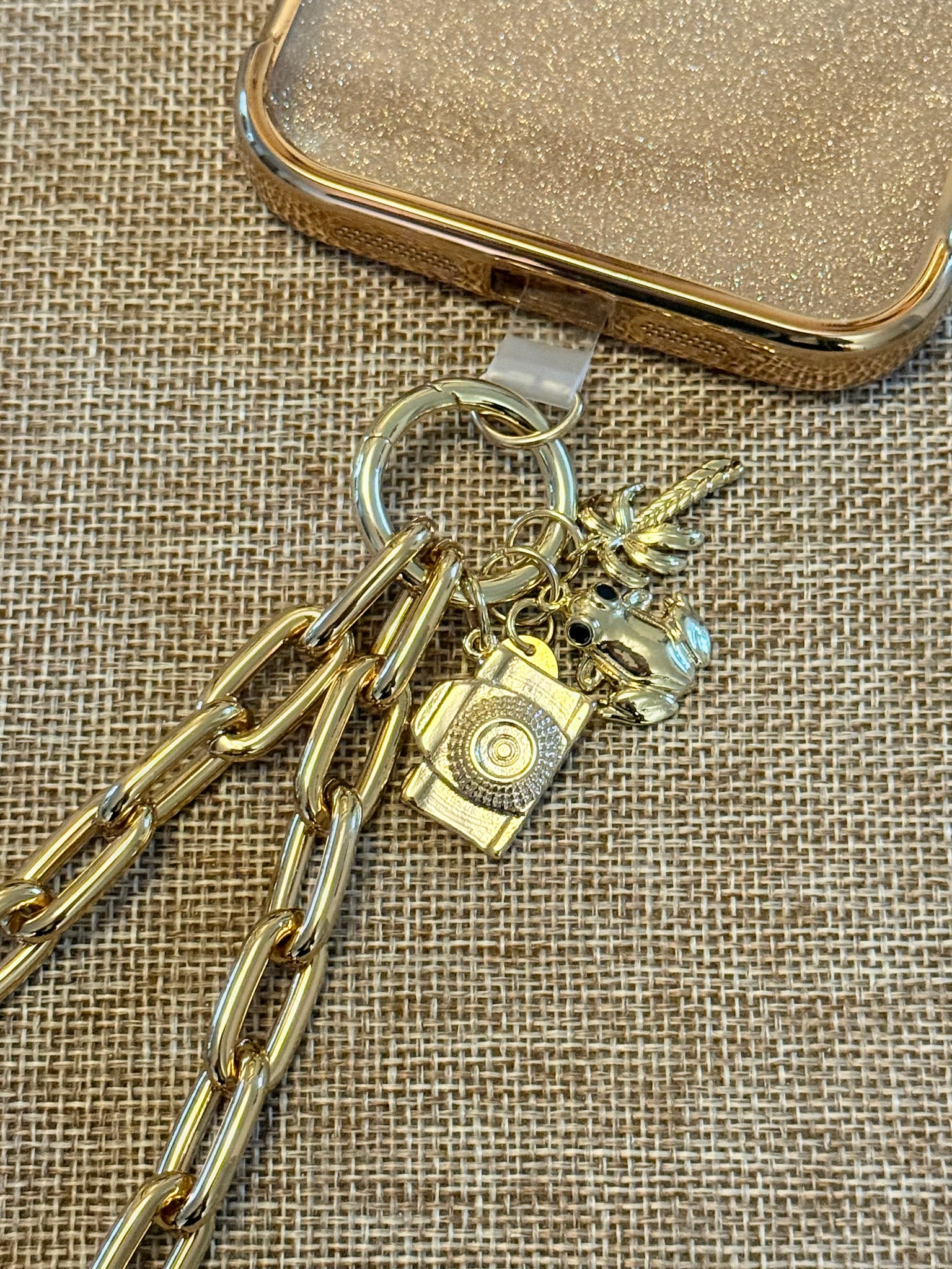 Iphone Bracelet/Holder in Think Chain with triple Charms Coqui, Camera and Palm in 18k gold plated. Comes with hook to attach to mobile.