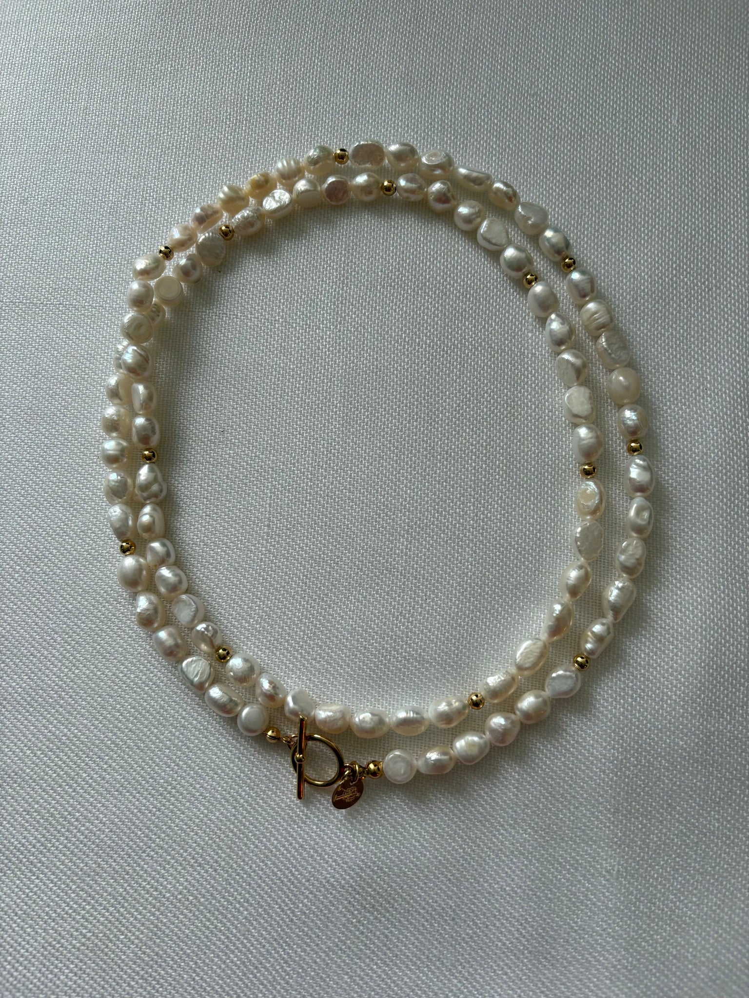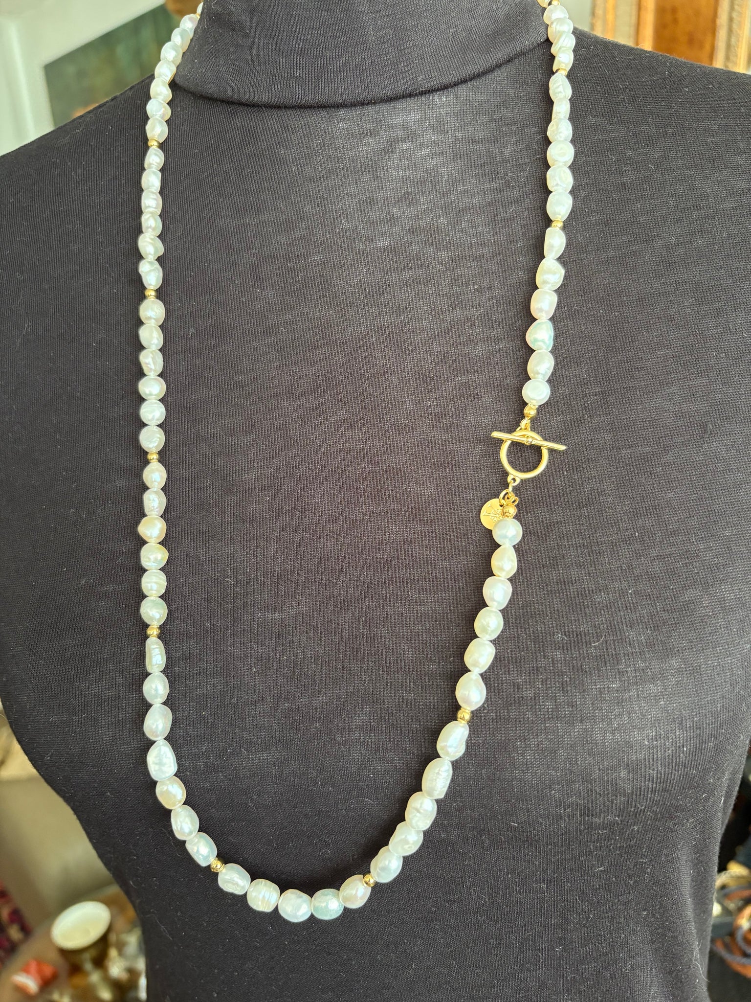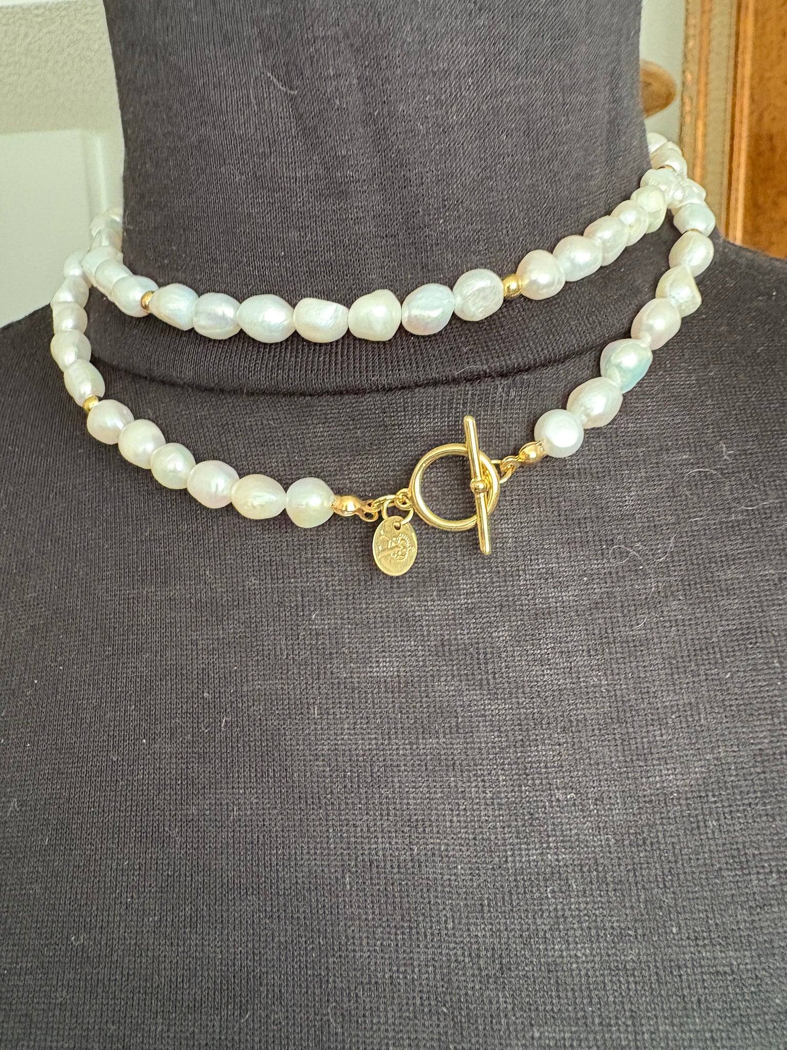 Necklace in baroque natural fresh water Pearls 8mm with beads & toggle clasp in 18k plated. “Transformable” can be used long or double strand chocker.